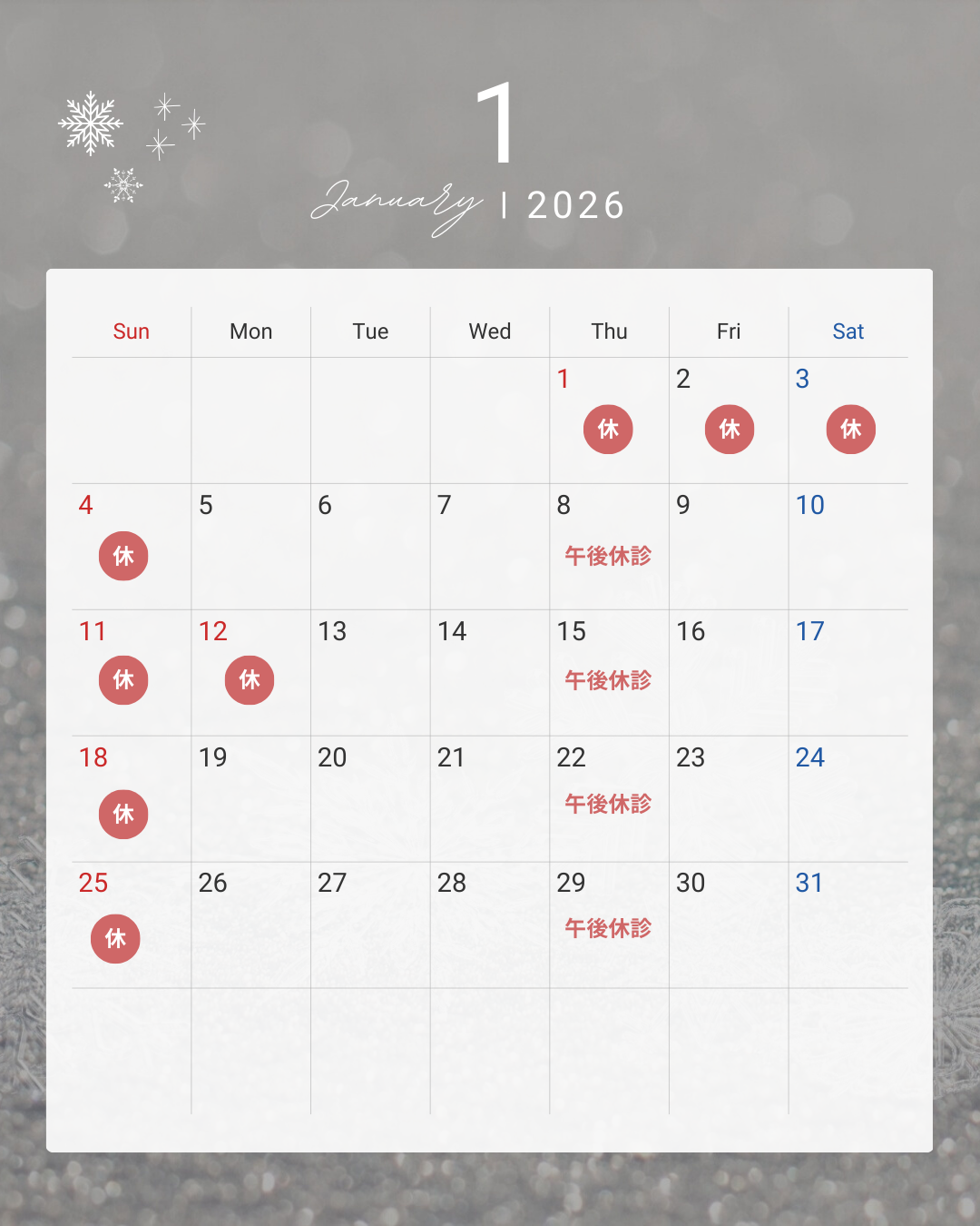 こんにちは! すまいる針灸接骨院六甲道院です!! 1月のカレンダーのお知らせです! 年末年始でお身体に疲れは残っていませんか? お悩みの方は早めのご連絡お待ちしていますね! ☎078-841-9818 &n … 続きを読む